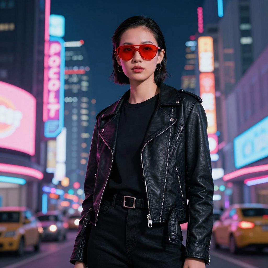 Stylishly attired woman wearing red-tinted sunglasses and a black leather jacket stands confidently against a vibrant cyberpunk cityscape backdrop, illuminated by neon signs and futuristic advertisements.