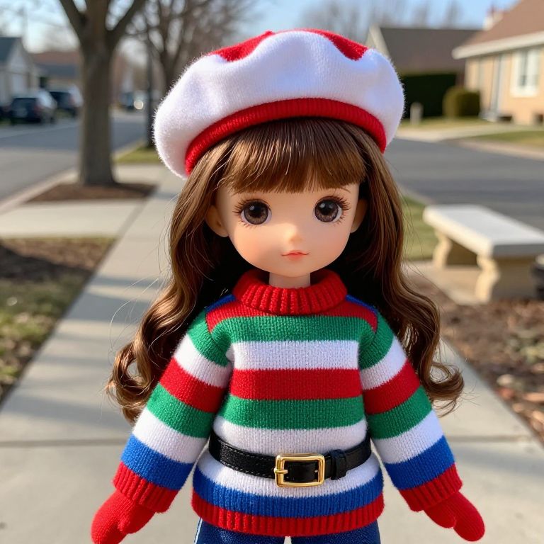 A detailed female doll with long, flowing brown hair, standing on a sidewalk in a suburban neighborhood. She wears a vibrant red, green, white, and blue striped sweater with a cozy collar, paired with a red and white beret that sits neatly on her head. Red gloves cover her hands, and she is secured with a black belt featuring a polished gold buckle. Her expression is gentle and curious, with large, expressive eyes that capture attention. The scene is softly lit by early afternoon sunlight, casting gentle shadows on the sidewalk, with nearby trees and a small stone bench in the background to add depth and realism to the environment.