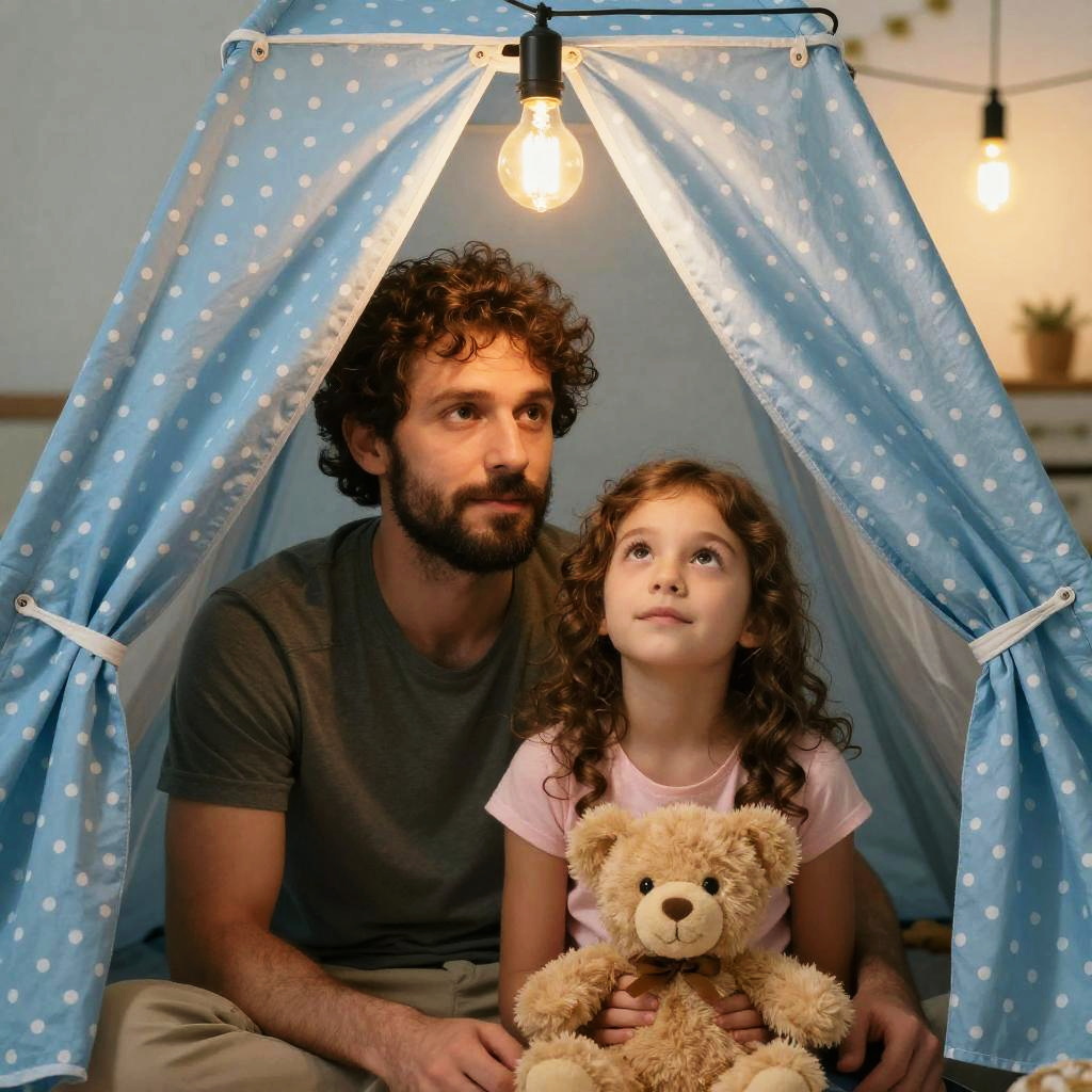 Photograph of a father and daughter sitting inside a blue, polka-dotted tent. The father, with dark curly hair and a beard, wears a green shirt, while the daughter, with curly brown hair, wears a pink shirt and holds a teddy bear. They're illuminated by a single glowing light bulb hanging above, with more bulbs visible in the background. The daughter gazes upwards with a dreamy expression.