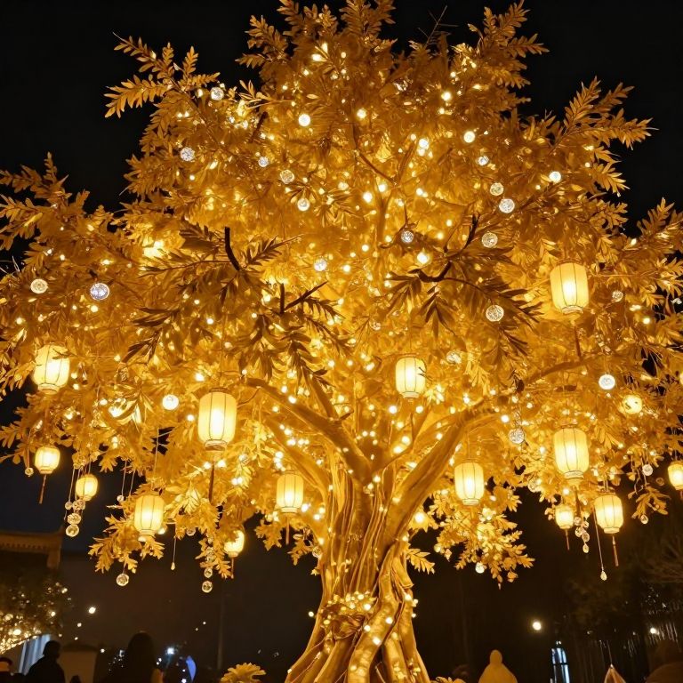 Photograph of a glowing, ornate tree with golden leaves and hanging lanterns, illuminated against a dark night sky.