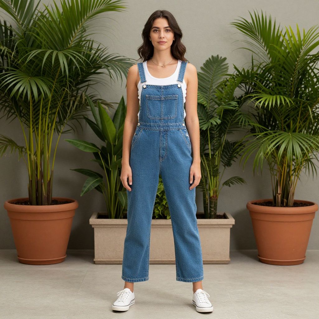 Romper Pants Costume, woman in blue overalls standing in front of potted plants