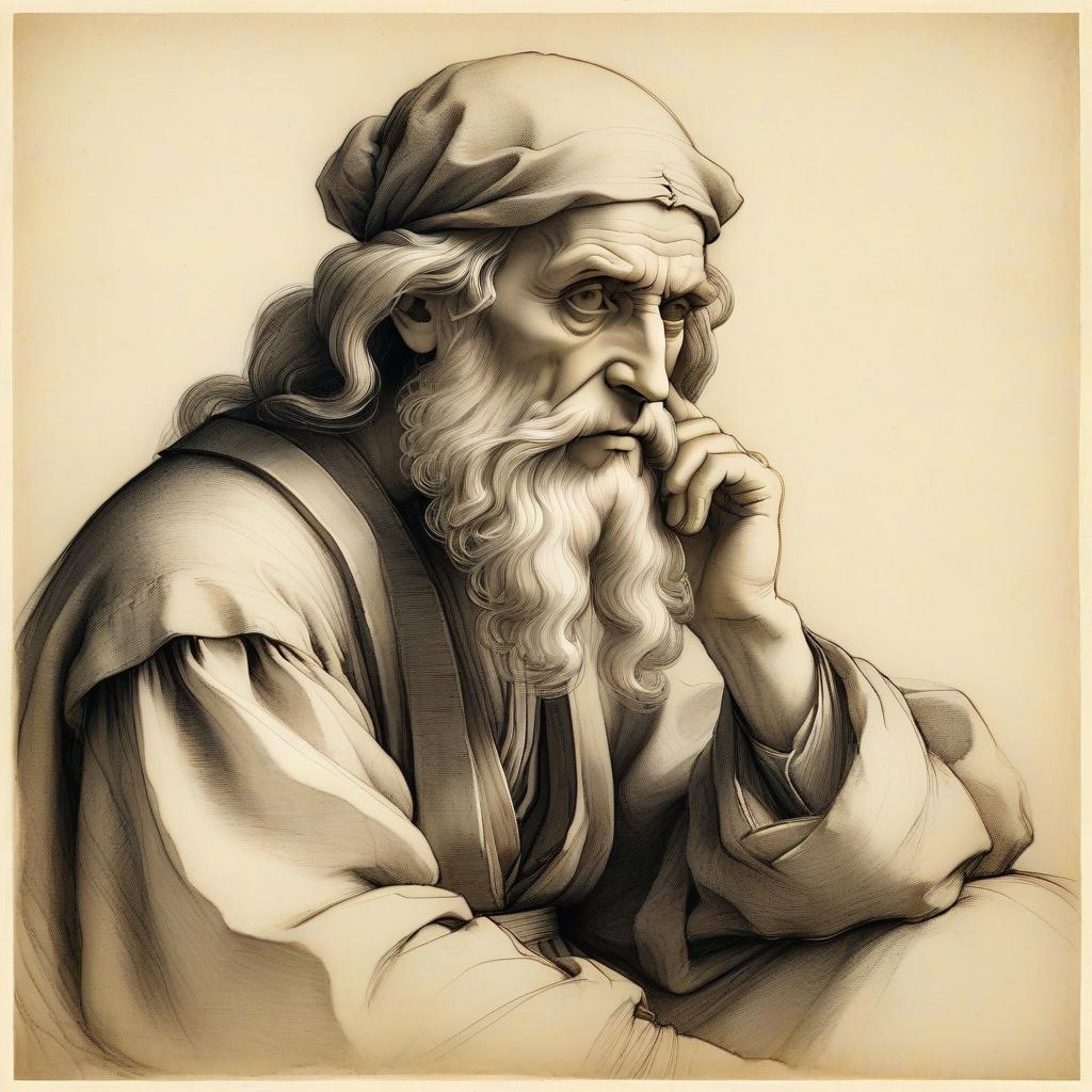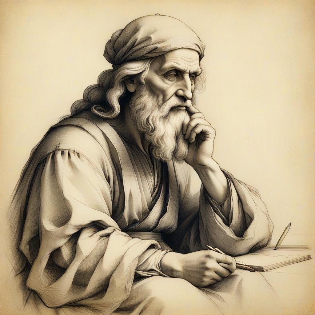 Classical pencil sketch by Leonardo da Vinci depicting a seated philosopher, with thoughtful expression, detailed facial features, and soft shading, in reflective and intellectual, timeless and masterful