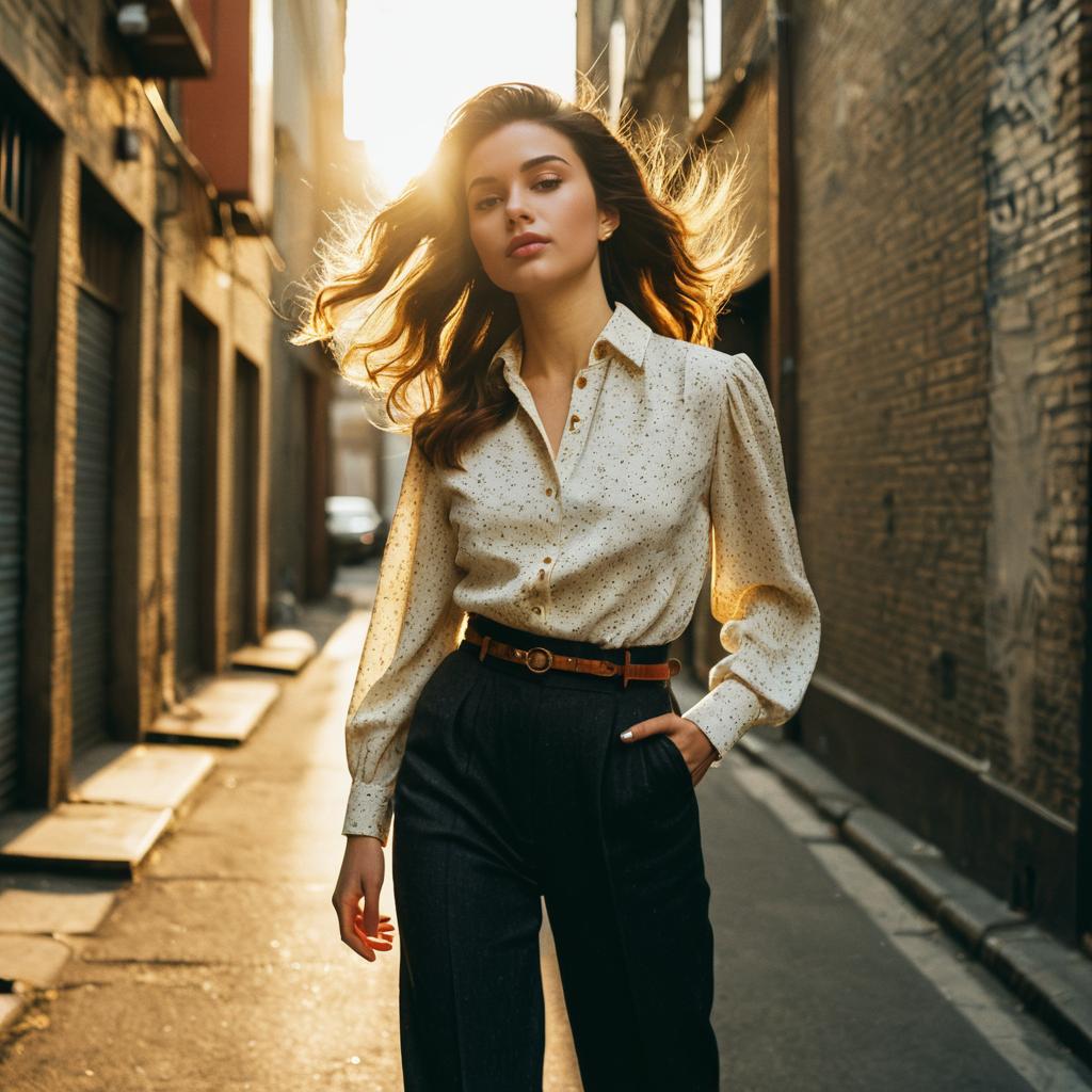 French Twist hairstyle on fashion model, wearing bohemian blouse and tailored pants, in urban rooftop, captured in fashion editorial style with golden hour backlight.