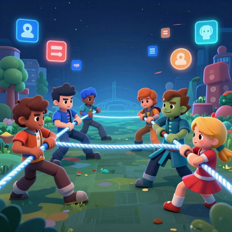 Clash Royale body swap: A playful anime-style scene featuring a Champion and a Pion with swapped bodies, surrounded by floating cards and battle animations, set on a fantasy island under a starry night sky with magical effects and soft glow.