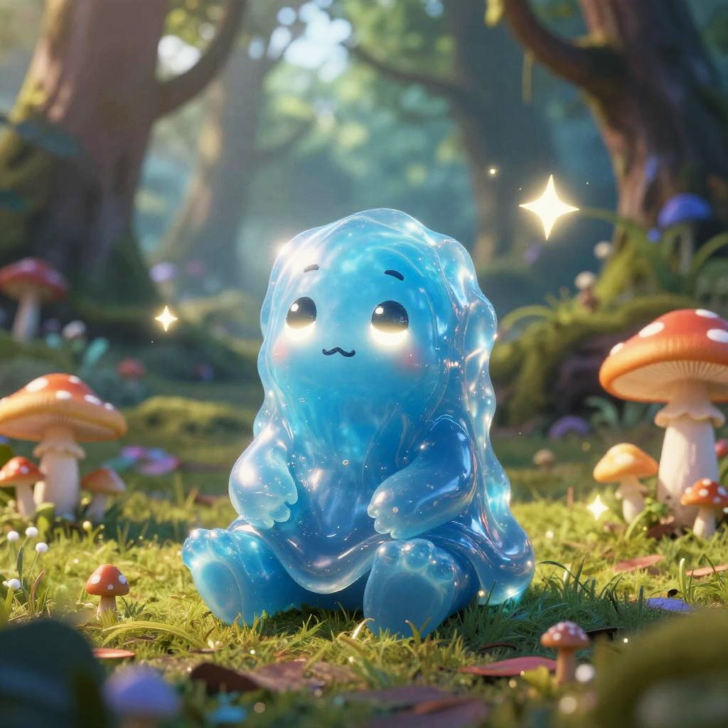 Blue slime character with shiny, translucent texture, playful expression, glowing eyes, sitting in a magical forest surrounded by sparkling mushrooms and soft light beams