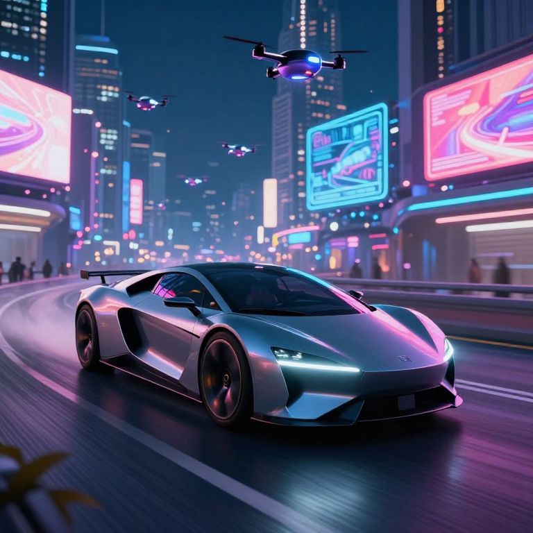 A mofern inspired concept vehicle speeding on a winding road through a neon-lit futuristic city, streamlined metallic body with illuminated accents, surrounded by holographic billboards and flying drones, under a night sky alive with colorful lights.