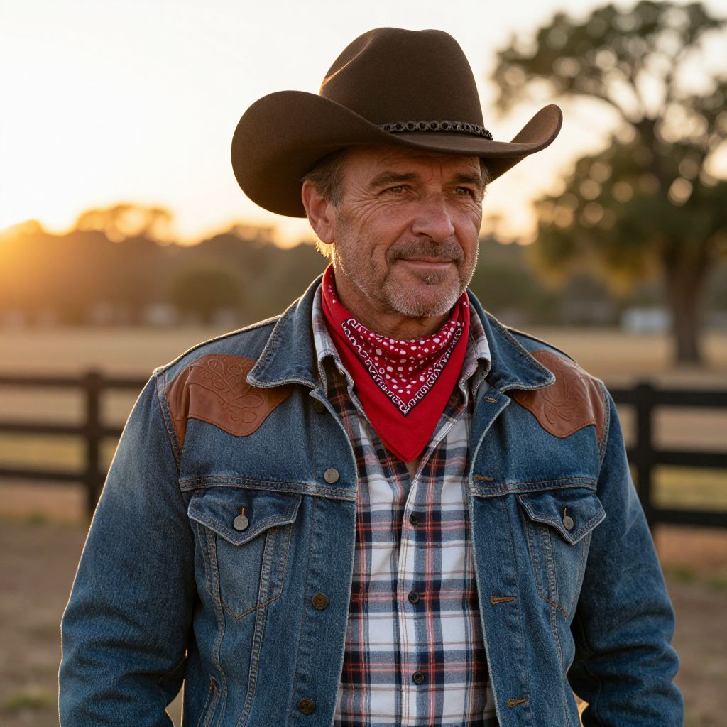 Photograph of a middle-aged man with a rugged look, wearing a brown cowboy hat, red bandana, blue denim jacket with leather patches, and a plaid shirt. He has a slight smile, gray stubble, and is standing outdoors at sunset with a wooden fence and trees in the background. The sunlight creates a warm, golden glow.
