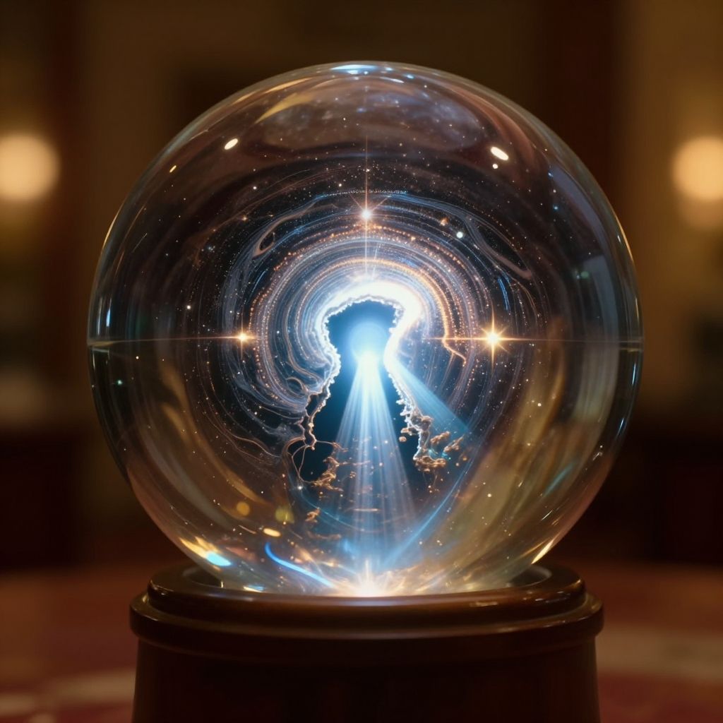 Photograph of a clear glass snow globe on a dark wooden base, centered in the image. The globe contains a bright, radiant light at its core, creating a starburst effect with sparkling, white star-like points. Surrounding the light is a swirling, cosmic pattern with shades of blue and black, resembling a galaxy. The background is blurred, featuring warm, ambient lighting that adds a cozy, indoor atmosphere. The glass surface of the globe reflects light, enhancing the celestial appearance. The overall image has a magical, ethereal quality with a focus on the luminous, central light.
