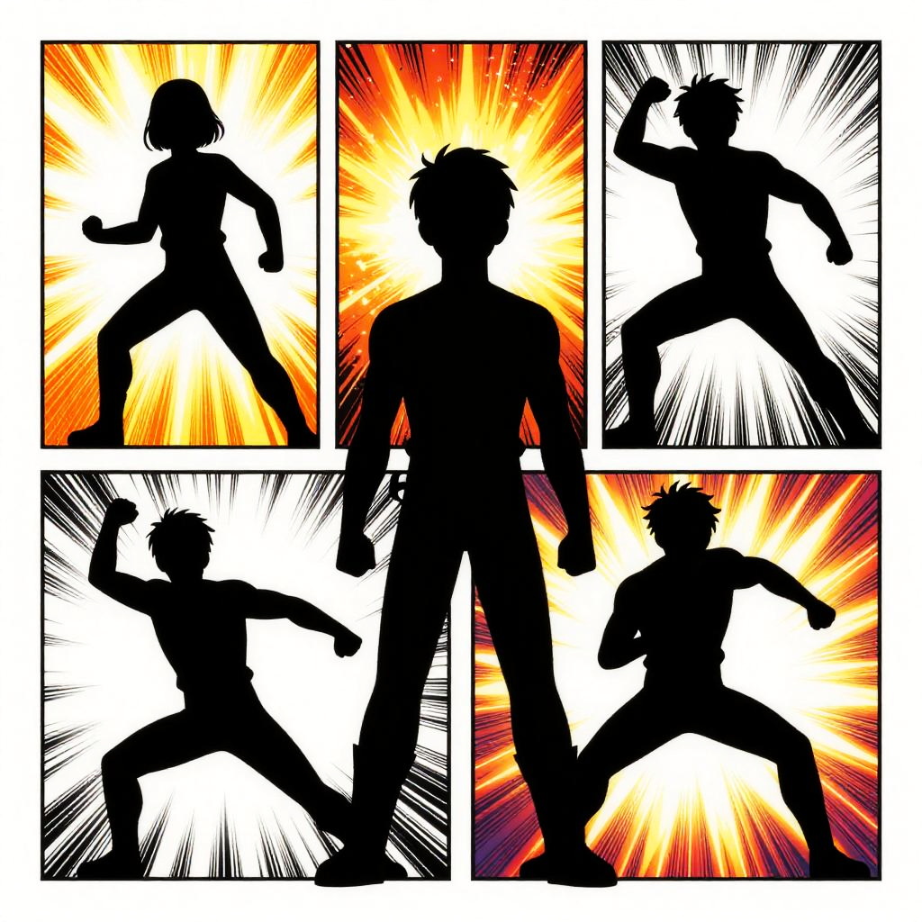 Genndy Tartakovsky style comic panel, featuring heroic characters with simple but striking designs, surrounded by explosive effects and stylized action poses, highlighting a blend of black silhouettes and vivid color splashes for dramatic impact.
