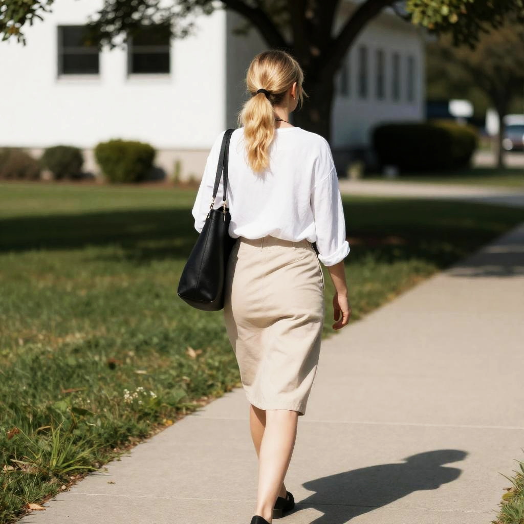 Blonde woman with hair tied in a ponytail, wearing a white blouse and beige skirt, carrying a black shoulder bag, walking on a concrete path beside green grass and trees. White building in the background under midday sunlight, casting clear shadows.
