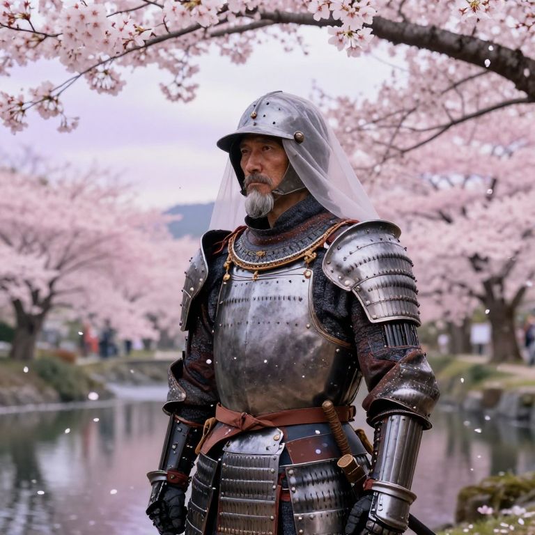 Depict a stoic medieval knight in full armor amidst an ancient Japanese cherry blossom landscape. His weathered visage, etched with wisdom and experience, gazes into the distance beneath a canopy of delicate petals falling like nature's timeless veil. The knight emerges from a double exposure of tranquil cherry trees and a serene pond mirroring the sky's palette of soft pinks and purples. Standing against this enduring backdrop, he embodies resilience and strength amidst life's fleeting beauty, inviting contemplation on the indomitable spirit within us all.