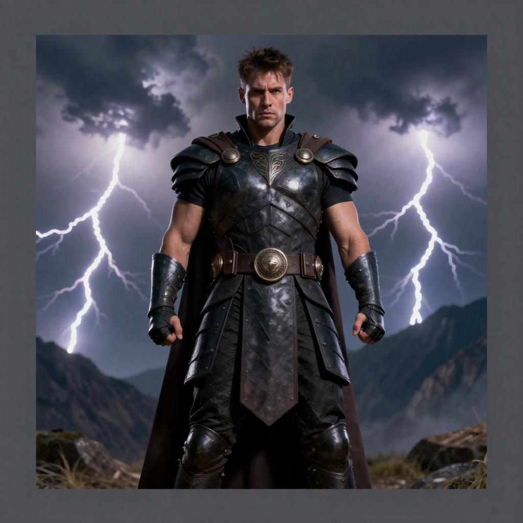Muscular man in dark, detailed armor stands centered, facing forward. Bright lightning bolts illuminate dark, mountainous background. Intense expression. Stormy sky with heavy clouds. Two lightning bolts on either side. Gray border. MovieStillDb.com in bottom right.