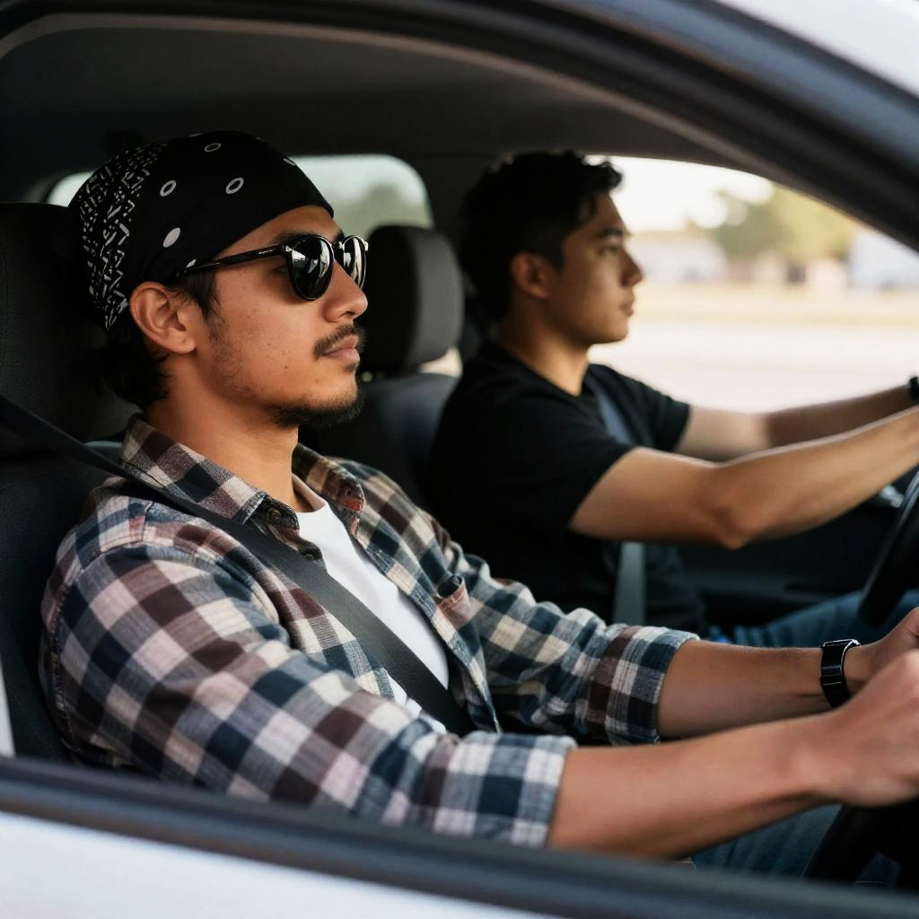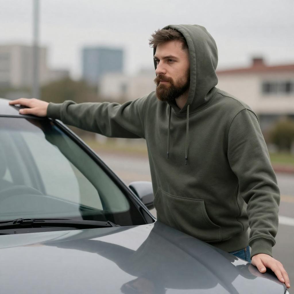 Bearded man in green hooded sweatshirt leaning on car hood, looking to the side. Background: blurred cityscape, overcast sky. Man's right hand on car roof, left hand on hood. Car is gray. Urban setting. Reflection of man's face on car hood.