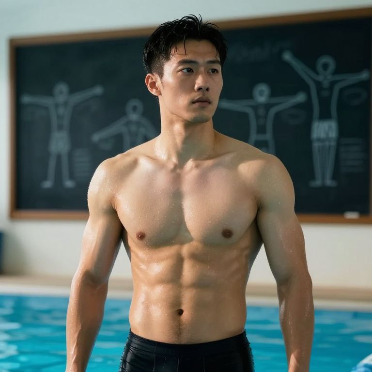 Male swimmer physique training in indoor pool, chalkboard with swim techniques in background, sweat glistening on skin, intense expression, soft natural lighting highlighting muscular form and strong arms