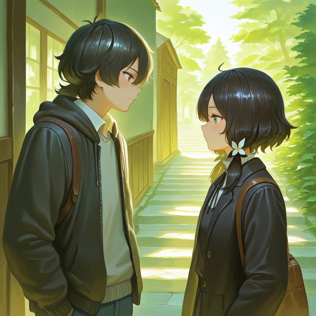 Digital anime-style illustration of a young boy and girl standing face-to-face outdoors near wooden buildings with sunlit steps and lush green foliage in the background. The boy has medium-length black hair and wears a dark hoodie with a backpack. The girl has short black hair adorned with a white flower and wears a dark jacket with a bow tie and a brown shoulder bag.