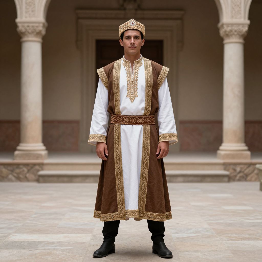 Photograph of a young man in traditional Middle Eastern attire with ornate brown and gold robe, white shirt, and black pants, standing in a marble