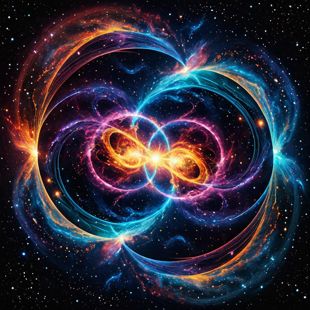 Fictional artwork logo for Quantum Computing Innovations, portraying a celestial scene of two nebulae intertwining in a cosmic dance of vibrant colors and swirling gases. The celestial bodies appear to embrace, emanating an otherworldly glow, capturing the beauty and mystery of the cosmos; ethereal and enchanting depiction in the background