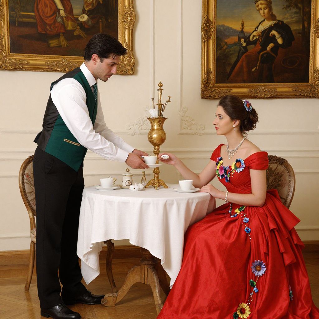 Elegant scene set in a refined interior where a man in a green vest and white shirt serves coffee to a woman dressed in a vibrant red gown adorned with floral embellishments, both seated at a wooden table draped with a white cloth, surrounded by ornate decor and framed paintings on the walls.