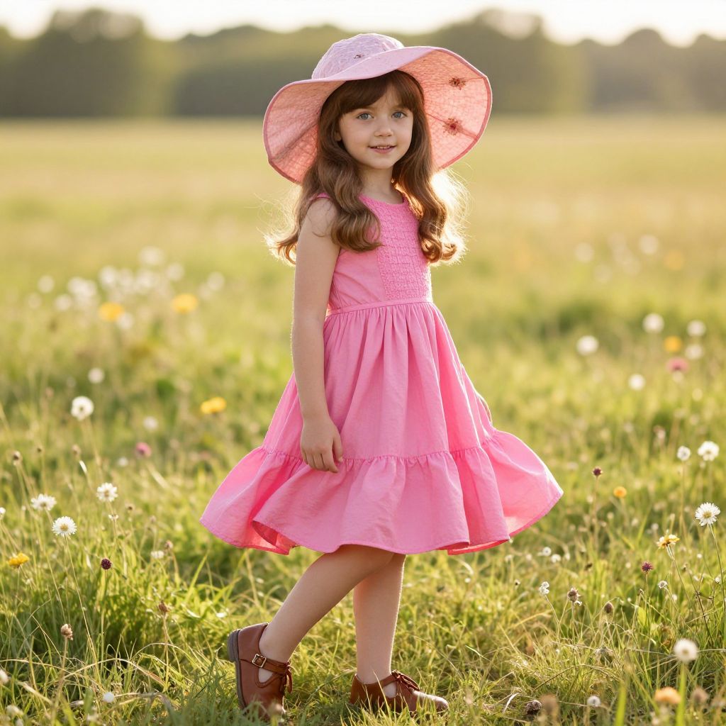 A beautiful young girl stands in a sunlit meadow, wearing a vibrant orange dress with elegant black accents along the sleeves and hem. She wears a wide-brimmed hat adorned with fresh orange flowers, adding a touch of charm and warmth. The scene is softly lit, with golden sunlight filtering through the trees, creating a serene and whimsical atmosphere. Her smile is bright and joyful, as if she's just discovered a secret in the world around her.