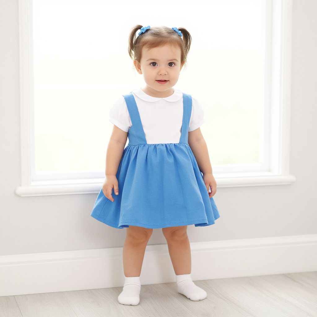 Photograph of a young Caucasian girl standing against a white wall and light wooden floor. She has light brown hair styled in two pigtails with blue hair ties. She wears a white short-sleeved shirt under a blue knee-length pinafore dress with suspenders. Her outfit is completed with white ankle socks. The girl has fair skin and big brown eyes, and she looks directly at the camera with a slight smile. The background is simple and brightly lit, highlighting the girl as the main subject. The image has a high-key lighting effect, making the colors appear vibrant and the background almost white.