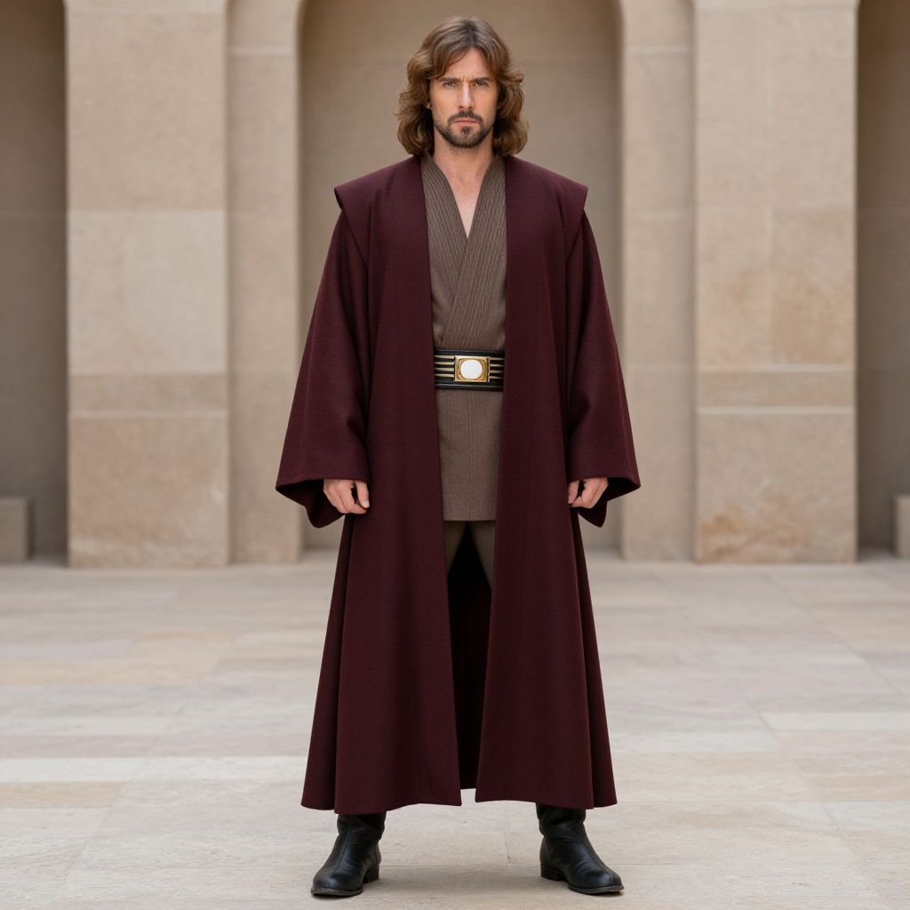 Photograph of a bearded man with long brown hair, wearing a dark purple Jedi robe, brown tunic, black pants, and black boots,