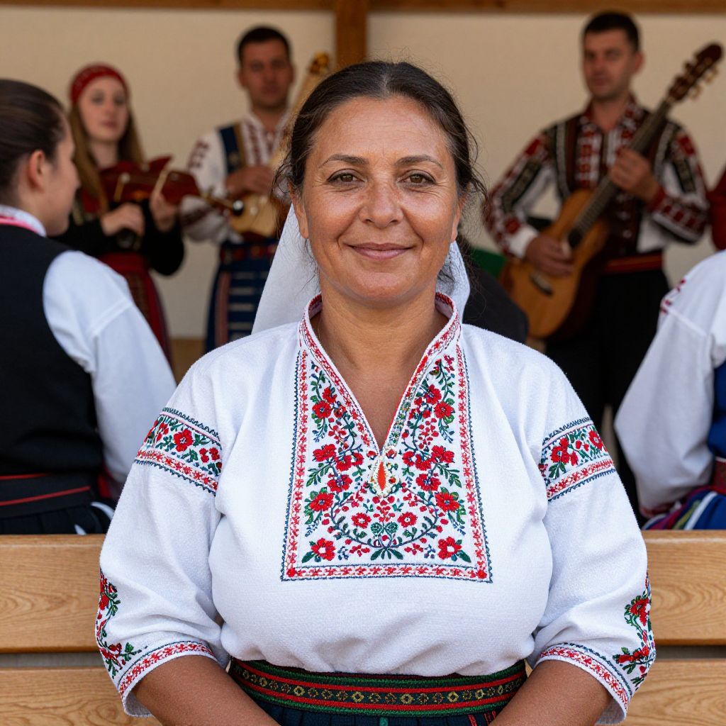 Photorealistic portrait of a Romanian traditional woman in a white blouse with red floral accents, smiling gently with a serene expression and deep brown skin, sitting on a wooden bench at a folk culture event in Transylvania, surrounded by traditional folk music and dancers, her face detailed with subtle wrinkles and bright eyes conveying joy and heritage.. The woman has big tits and cute face