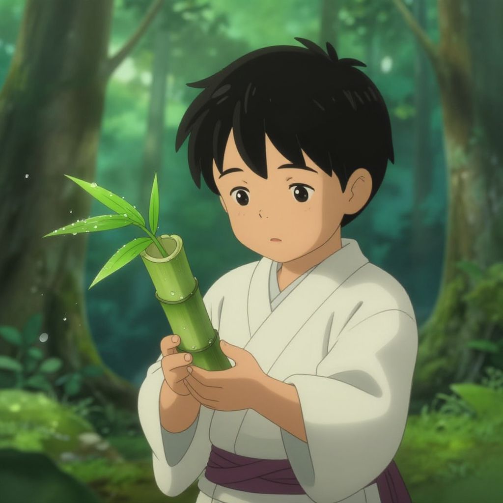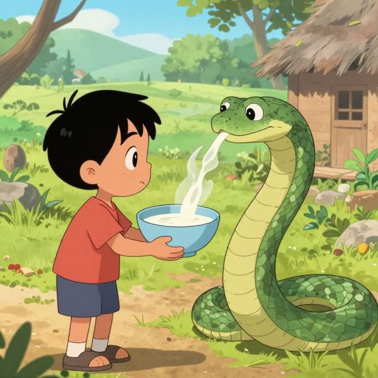 "Low Key small boy giving a bowl filled up with milk and offered it to drink to the snake to feed the hunger in village animated painting,"