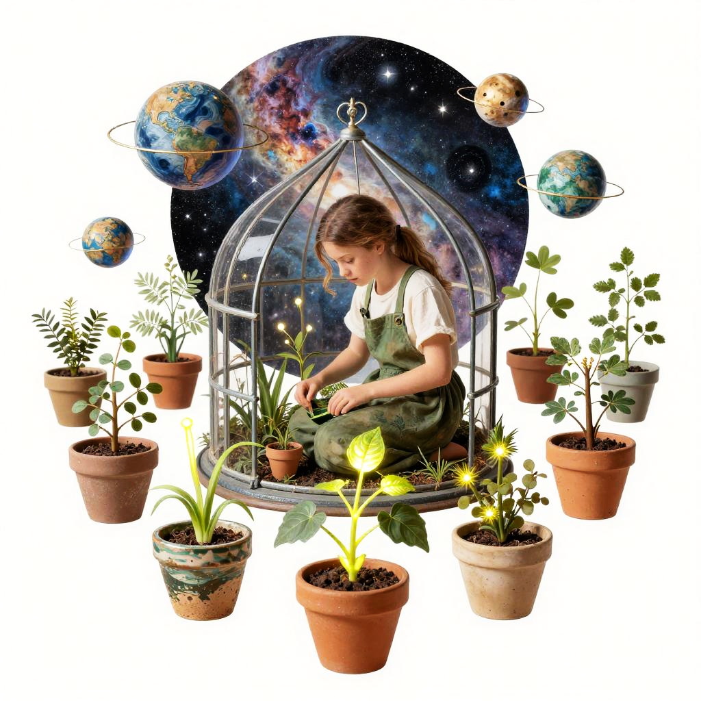 An artistic portrayal of a cosmic gardener, surrounded by levitating miniature planets in ceramic pots, luminescent vines, and tiny orbiting moons, in a suspended greenhouse orbiting a nebula, created in a mixed-media collage blending botanical illustration, starfield gouache, and metallic ink highlights, with tranquil, whimsical, and contemplative