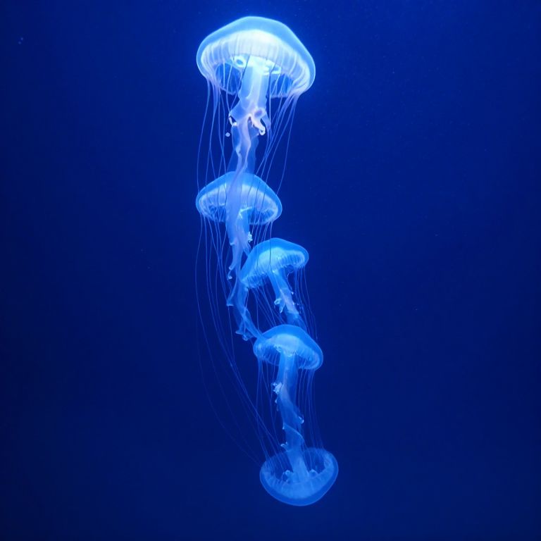 Glowing translucent jellyfish float gracefully in a vertical formation, their bioluminescent bodies illuminating the deep blue ocean as they drift upward toward the surface, creating a mesmerizing underwater spectacle.