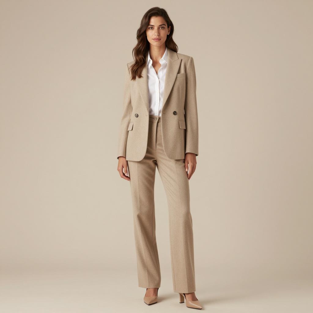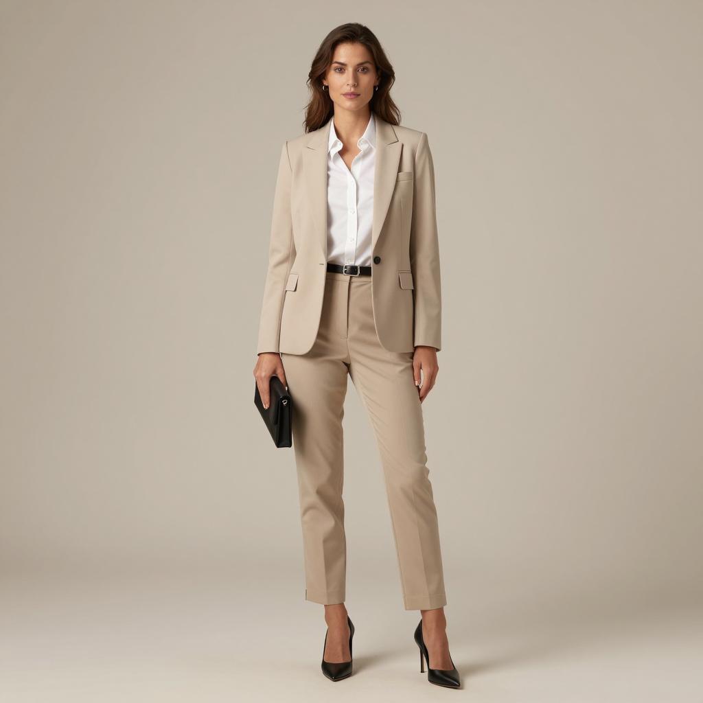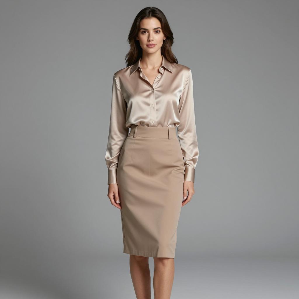 Carrie underwood clothing, photograph of a blonde woman, standing, neutral background, beige satin blouse, long sleeves, buttoned, midriff showing, high-waisted beige satin skirt, knee-length, casual, confident expression, straight hair, shoulder-length, minimal makeup, natural light, fashion photography, plain background, soft shadows, simple, elegant, modern, feminine, stylish, professional attire, upright posture