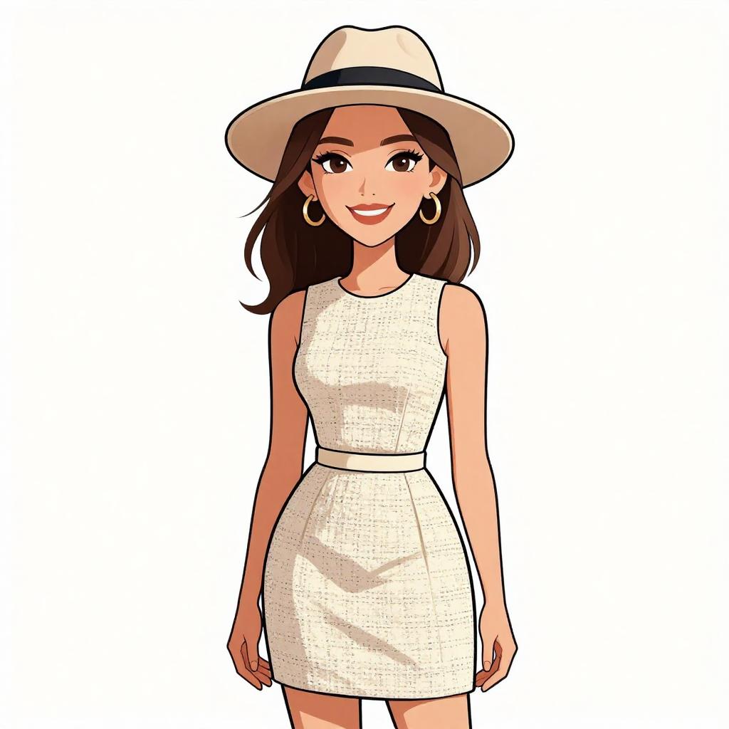 Woman with pretty face and pretty hair. smiling Woman, casual bohemian, navy blue short dress with a sheer overlay, scoop neckline, button-front detail, short sleeves, flared skirt, brown wide-brimmed hat, layered necklaces, thin bangle bracelets, white background. --sref 1467