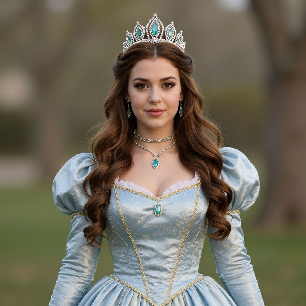 Shrek fairy godmother dress, 1girl, solo, dress, brown hair, breasts, crown, cleavage, long hair, tiara, choker, cape, jewelry