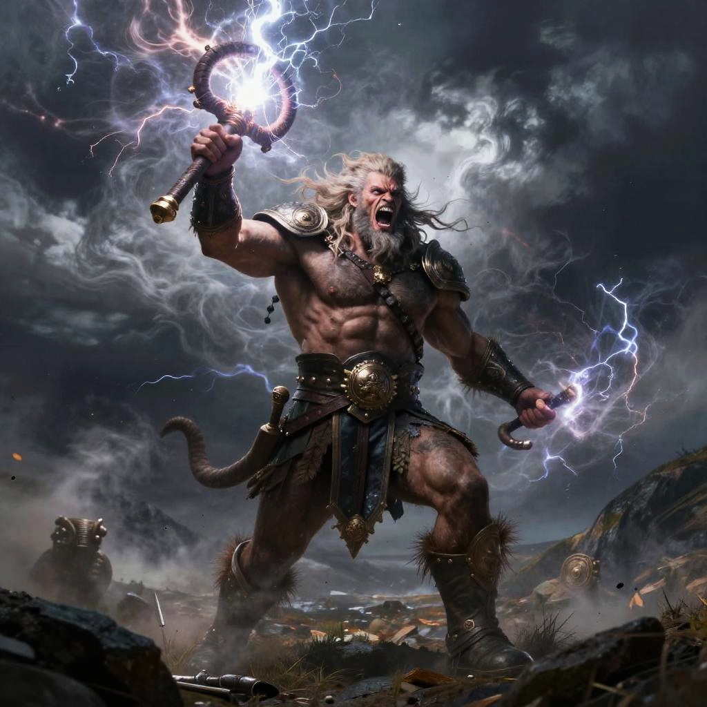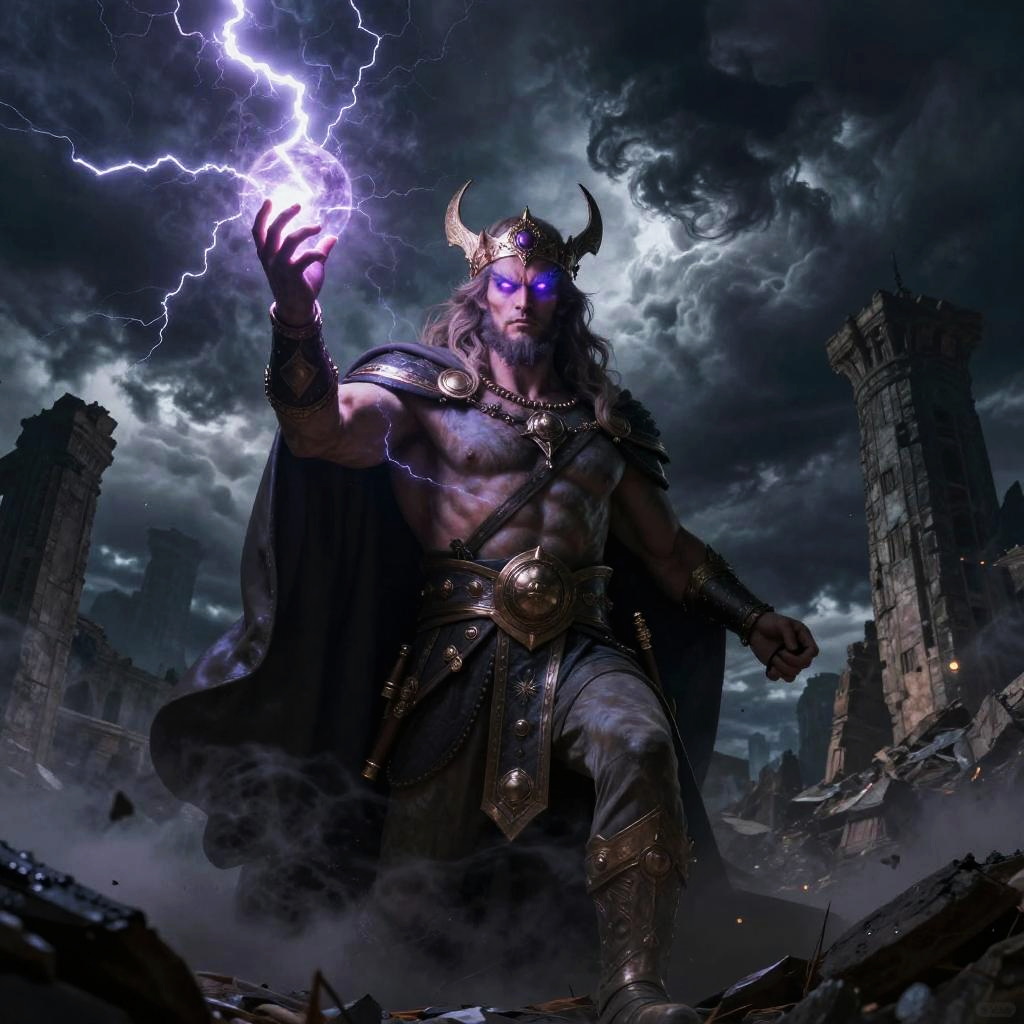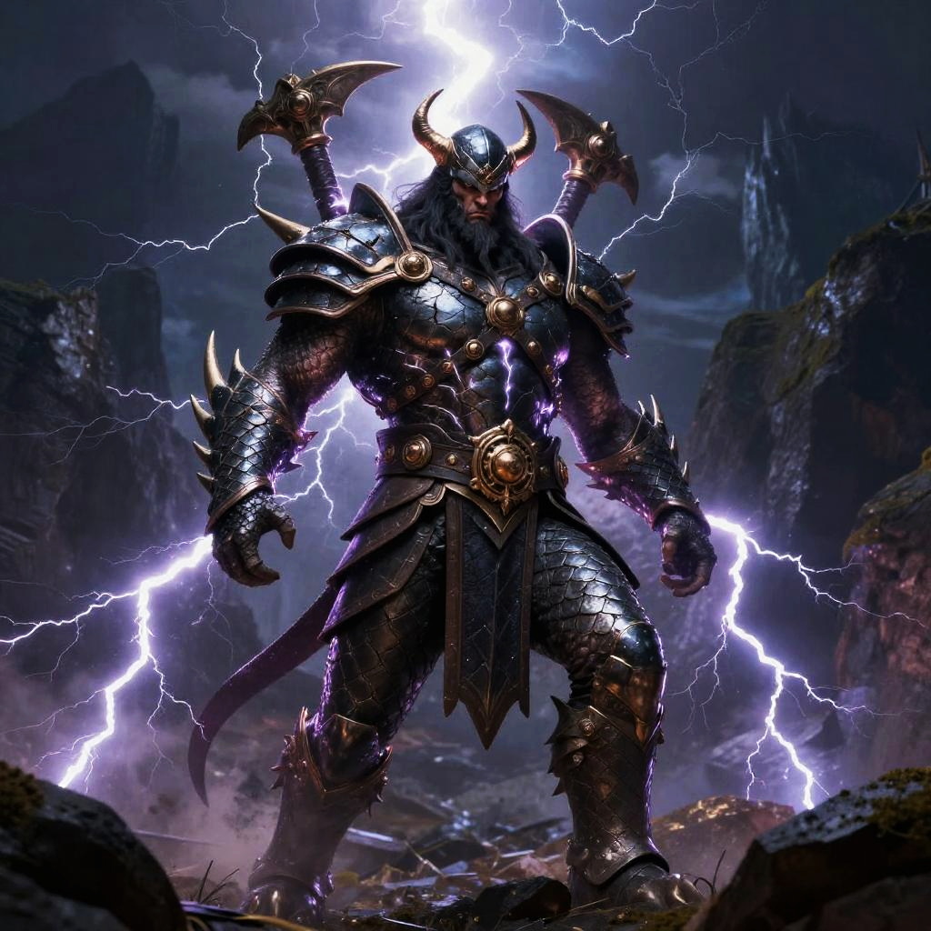 Perun – God of thunder and war, depicted as a fierce warrior with a flaming sword and radiant armor, standing in a volcano surrounded by arcs of electricity.