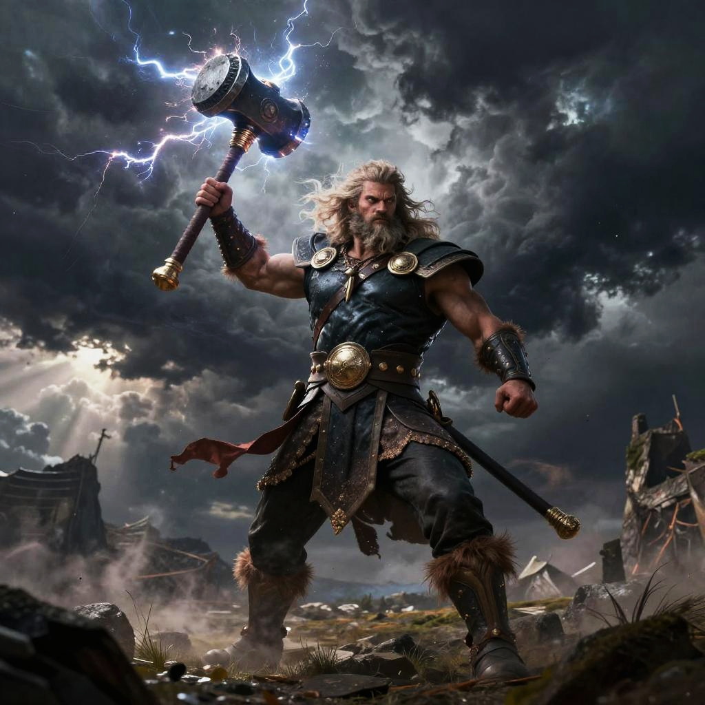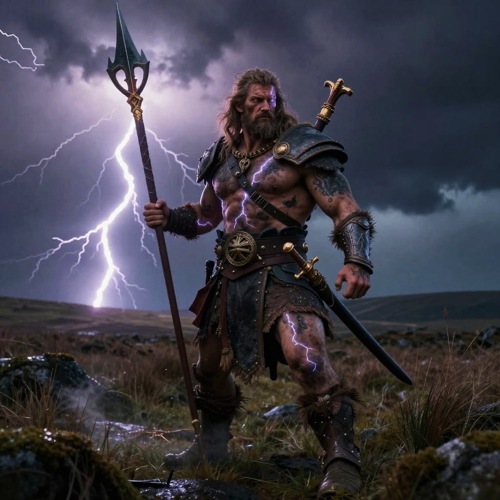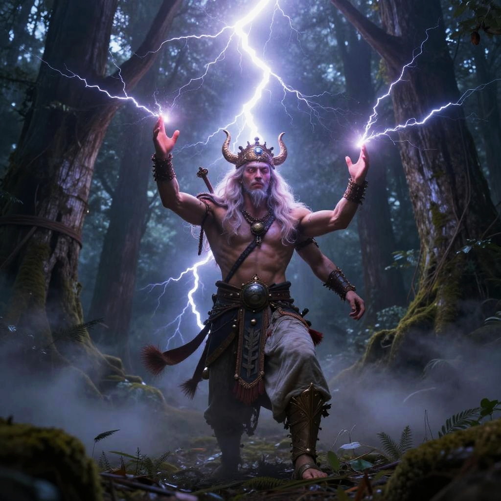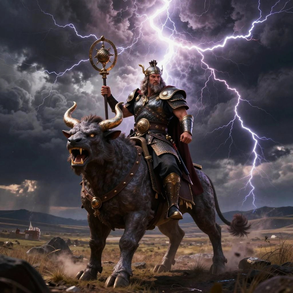 Perun – God of thunder and war, depicted as a fierce warrior with a flaming sword and radiant armor, standing in a volcano surrounded by arcs of electricity.