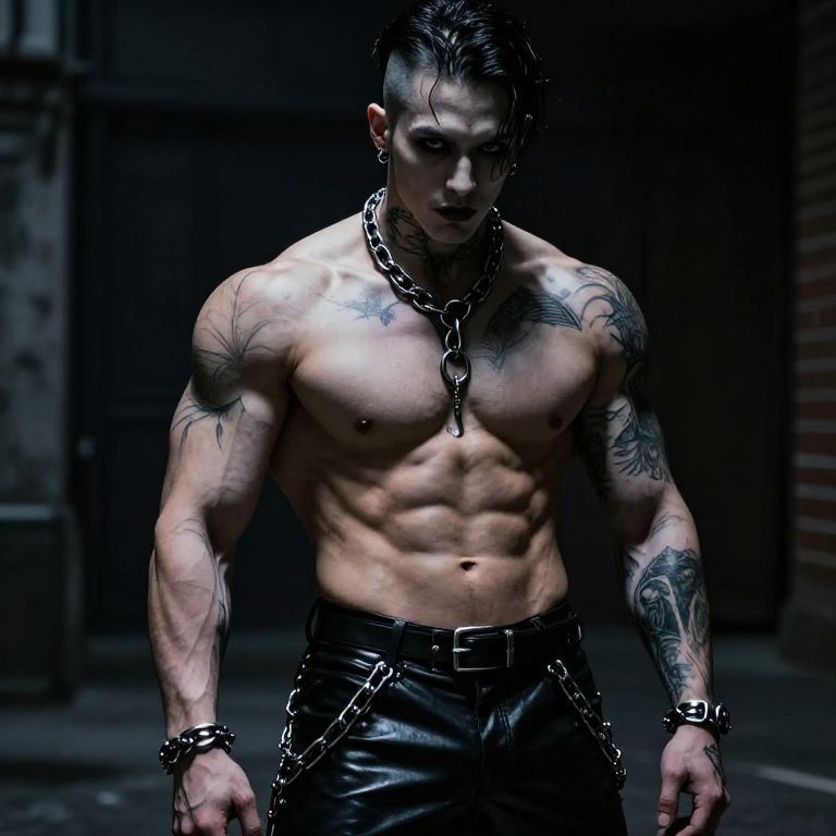 Goth bodybuilder in dark urban setting, muscular physique with black leather outfit, heavy silver chains, pale skin, dramatic shadow lighting, moody gothic atmosphere, detailed tattoos and piercings, intense gaze, high contrast.