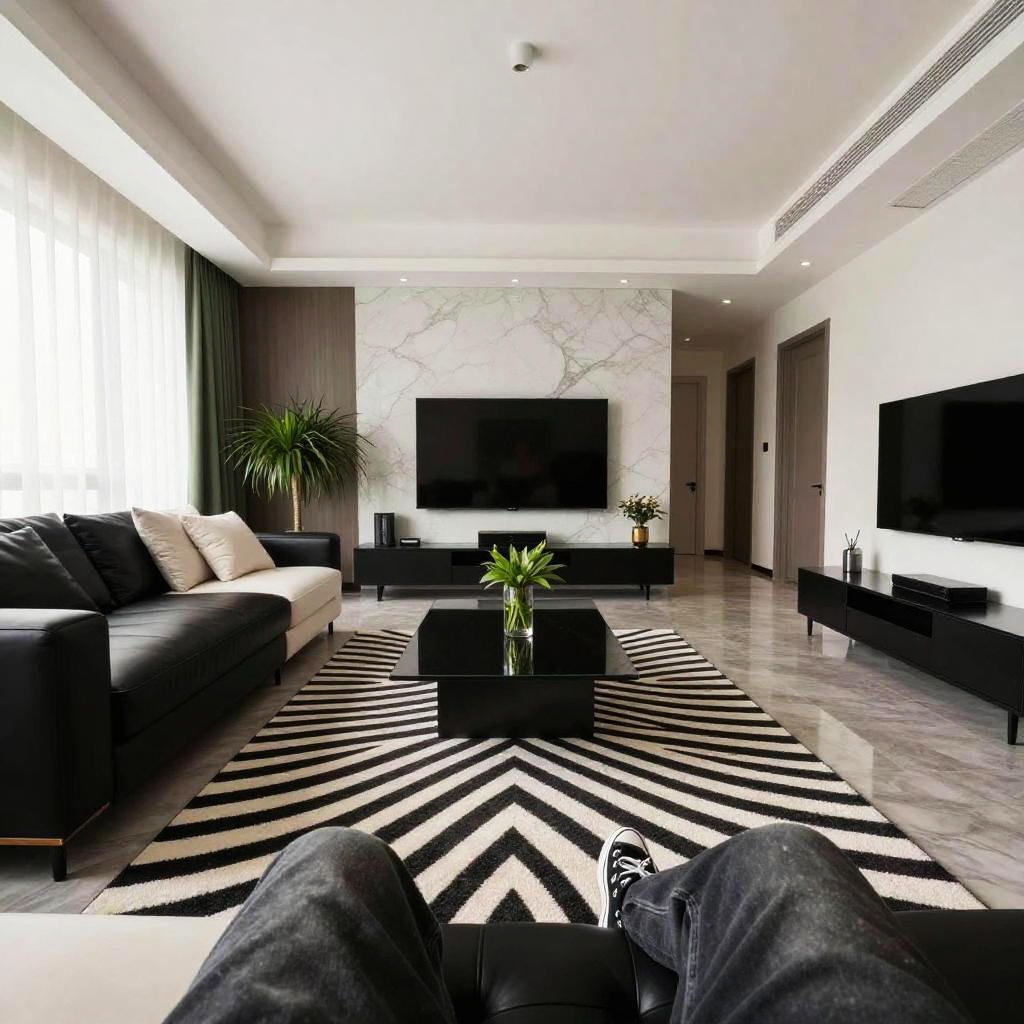 Photograph of a modern living room with a monochromatic color scheme. A black leather sofa with beige cushions is on the left, facing a black rectangular coffee table with a vase of green plants. The floor features a bold black and white chevron-patterned rug. Two flat-screen TVs are mounted on the white marble wall behind the coffee table. A potted plant is on the left side. The room has large windows with white curtains, dark brown wooden accents, and a sleek, minimalistic design. The viewer's legs in dark jeans and black sneakers are visible at the bottom.