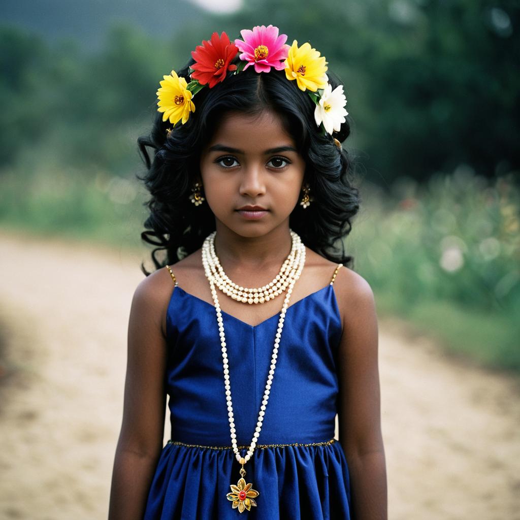 Kid sri krishna costume,1girl, solo, jewelry, flower, necklace, blurry background, hair ornament, looking at viewer, dress, blurry, black hair, dark skin, hair flower, closed mouth, dark-skinned female, realistic, outdoors, bracelet
