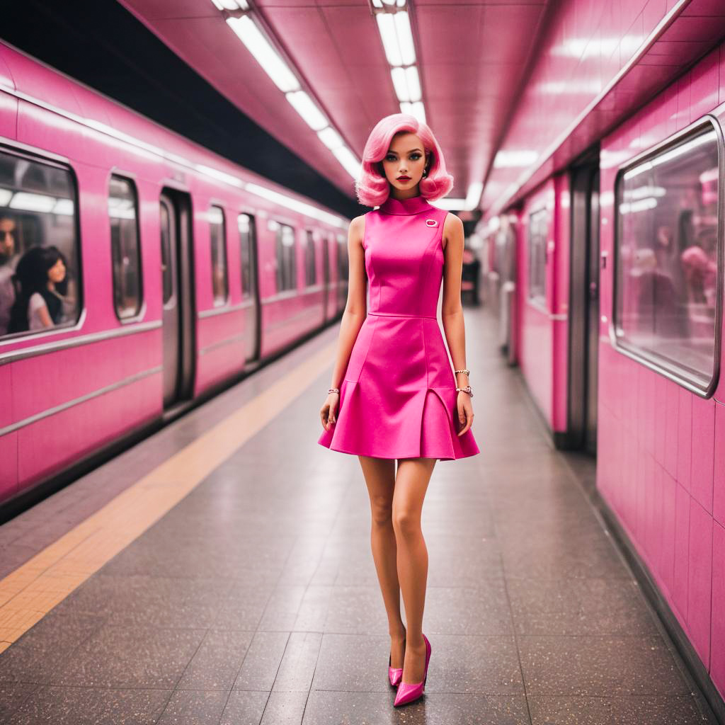 Photo of a V-Taper woman, Side Part barbie outfit, pink mini dress with Amaranth and Spandex, high heels, subway station, ethereal light