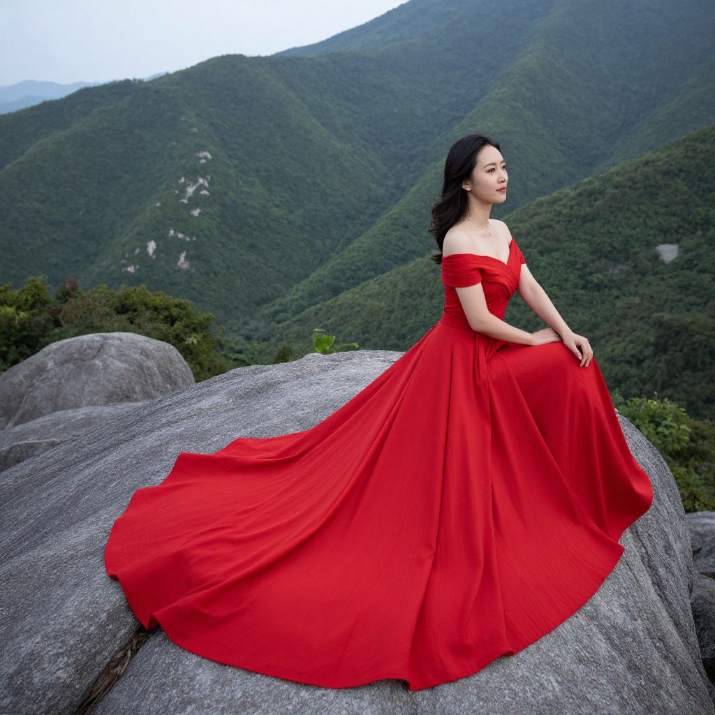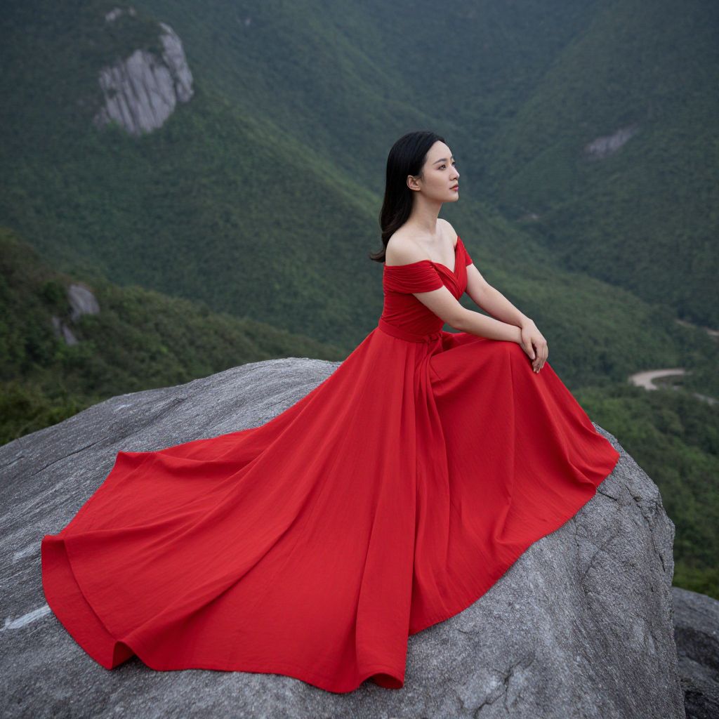 Asian woman in vibrant red off-shoulder gown, sitting on large gray rock, overlooking lush, green mountainous landscape, photograph.