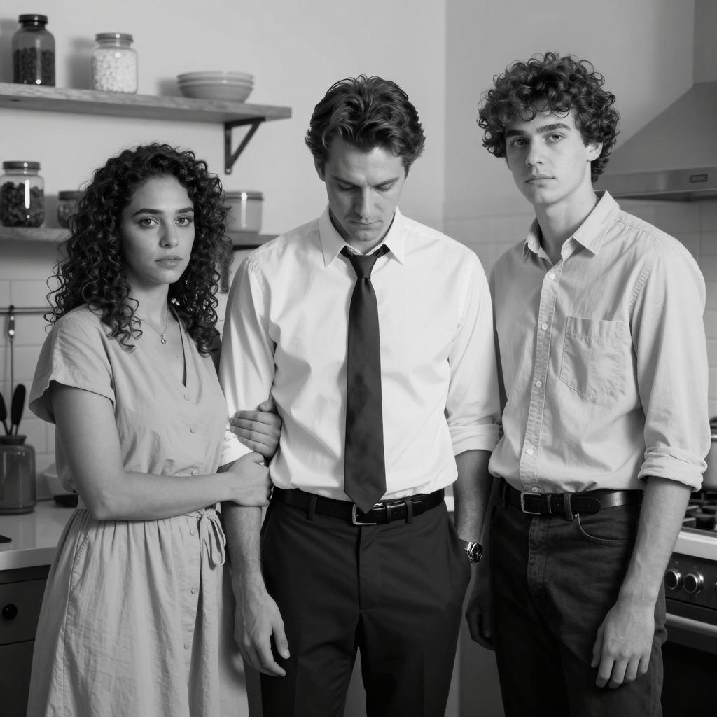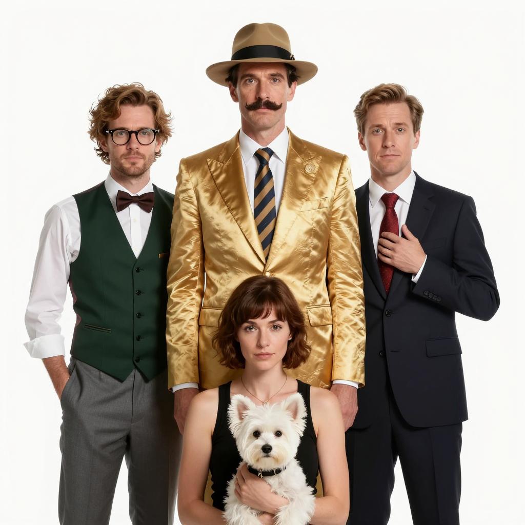 Group of seven people in a room. Two men in the foreground, one with short brown hair, one with blonde hair, both smiling. One man in white shirt and black tie, left hand on face. Woman in green dress and red headband to the right. Three women and one child in background. Christmas decorations, green curtains, wooden window frame. Casual, retro clothing. Man in black checkered vest to the left. Woman with curly blonde hair and black dress to the left. Child in red dress with white polka dots. Natural light.