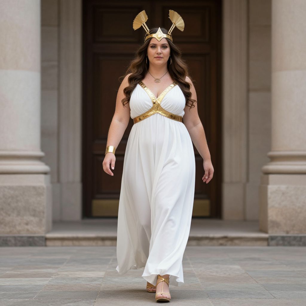 Plus Size Athena Costume, a woman in a white dress and gold headpiece walking in front of a building