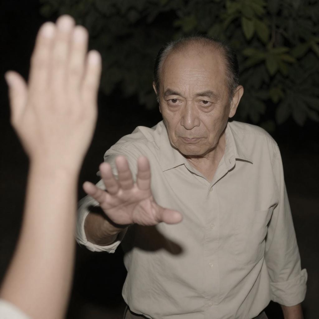 Photograph of an elderly Asian man with a bald head, sitting in a dimly lit industrial warehouse. He wears a dark jacket and gestures with both hands. Background includes a large column, hanging fabric, and two people in the distance, illuminated by bright light and smoke. Warm orange light on the right, cool blue light on the left.