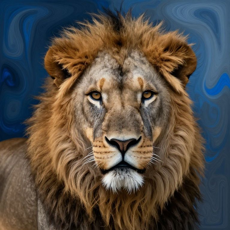 Create an image of a lion with photorealistic details, rendered from a unique perspective akin to a 'bug's-eye view', highlighting its intricate whiskers and intense gaze. Set against a background of swirling shades of blue and gray that convey both isolation and might, this digital art piece should transition emotionally from the solitude often seen in Picasso's Blue Period to the potent symbolism of the lion's strength and dignity. This artistic fusion aims to produce an image that transcends conventional art forms by blending vibrant colors with fluid lines reminiscent of Picasso's style into a powerful representation of nature's majesty.