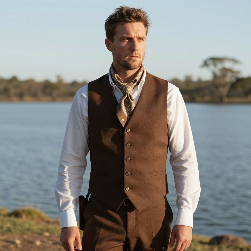 Man From Snowy River Costume, man in a brown vest and scarf standing in front of a body of water