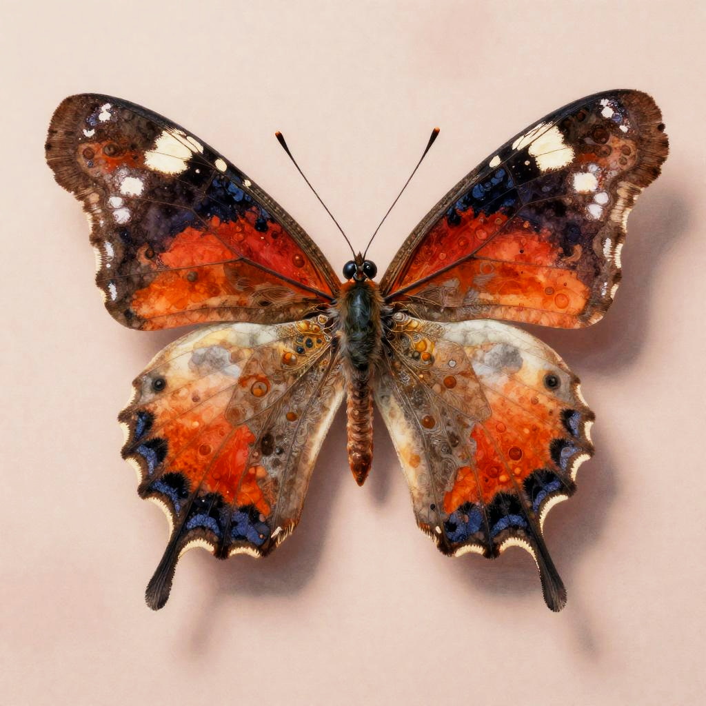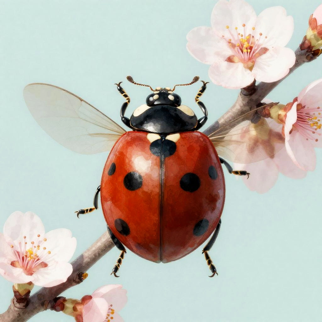 Full body, solo, animal_focus, ladybug, wings, antennae, intricate_details, vibrant_colors, detailed_animal_anatomy, cherry blossom, light teal background, watercolor_style, delicate_textures, dynamic_composition, painterly_approach