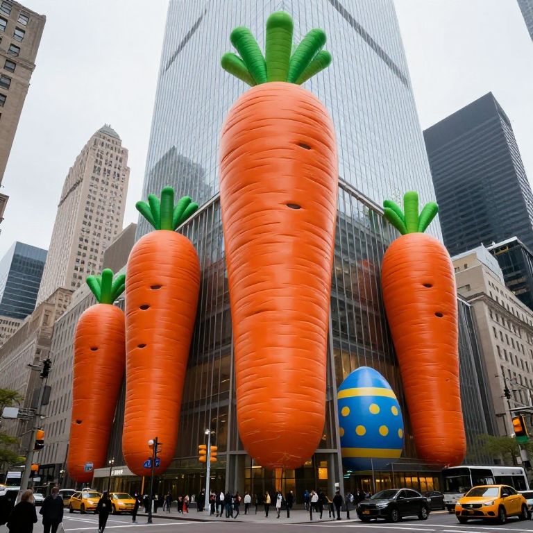 Carrot street view of manhattan highrise buildings with gigantic colourful easter eggs in between, the eggs have a similar height as the highrise buildings,