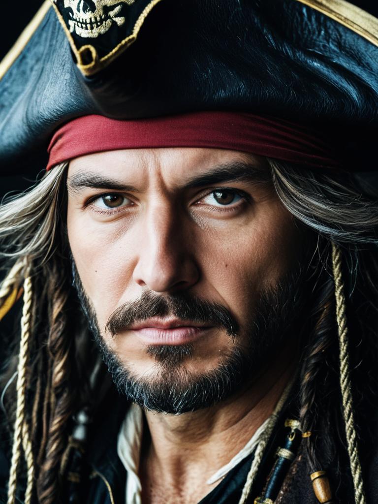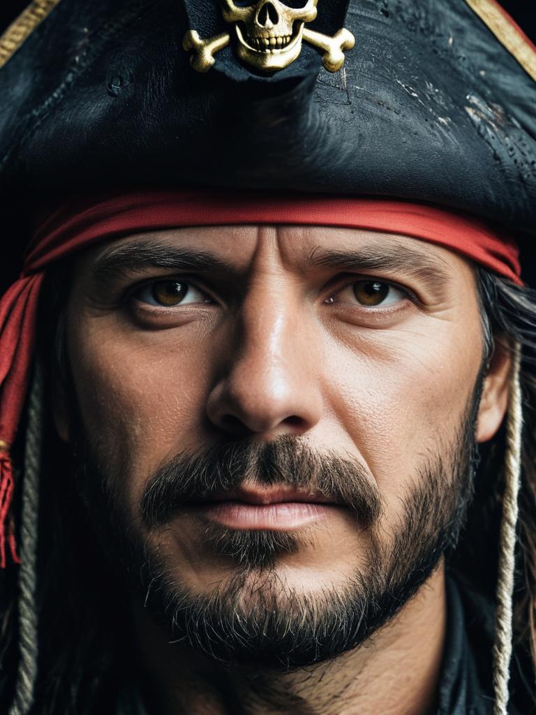 Man in Pirate Costume, close-up detailed headshot with pirate hat