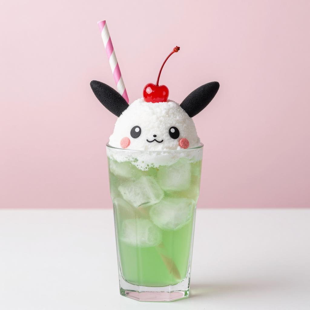 A photo of a pink, spherical glass cup with a face, filled with a pink and white layered dessert topped with whipped cream and a cherry with a stem. The cup has large, black, circular eyes and blush marks. The background is solid pink, and the surface is white.