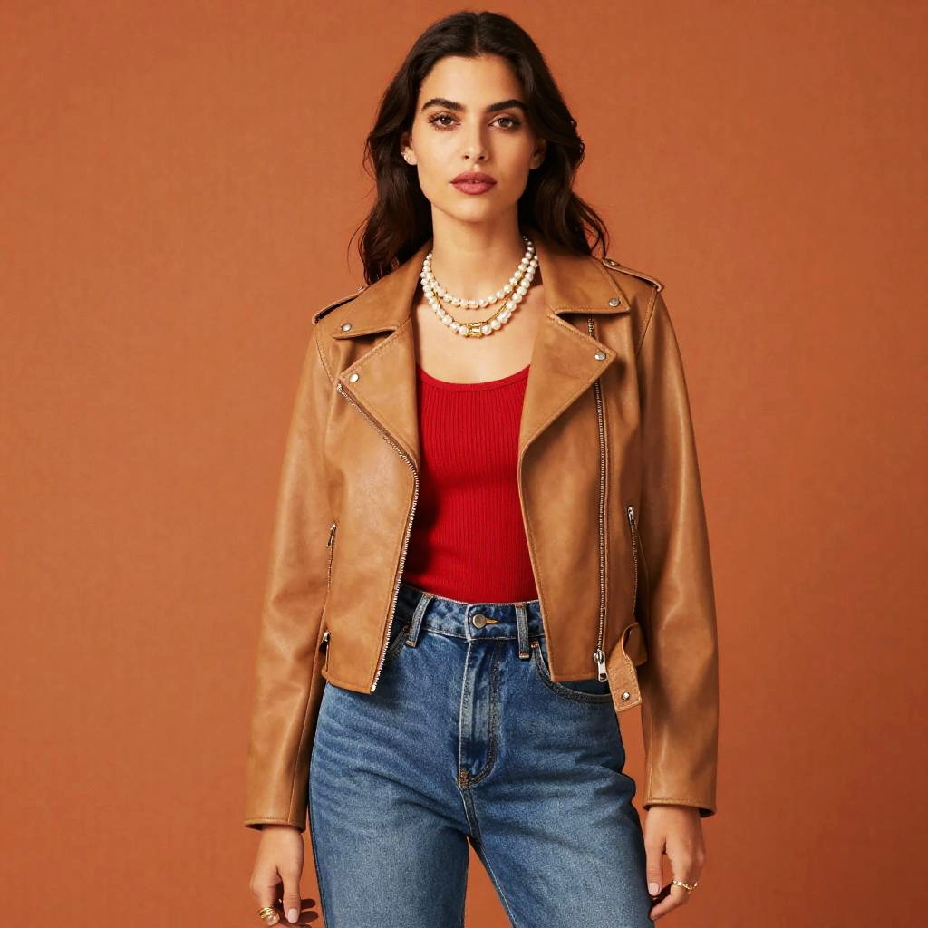 A stylish woman poses confidently against a textured orange background, wearing a tan leather biker jacket with zippered front and notched lapels. Her casual chic outfit is completed with a red ribbed top, high-waisted blue jeans, and layered pearl and gold statement necklaces, creating a bold yet elegant modern look.