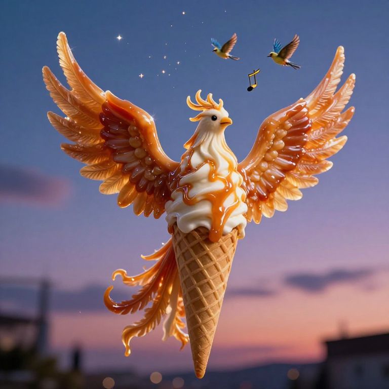 In a twilight sky where dreams blend with reality, a phoenix-shaped ice cream cone ascends, its wings of caramelized sugar catching the fading light, as edible birdsong whispers lullabies amidst the celestial ballet of stardust and melting sweetness.